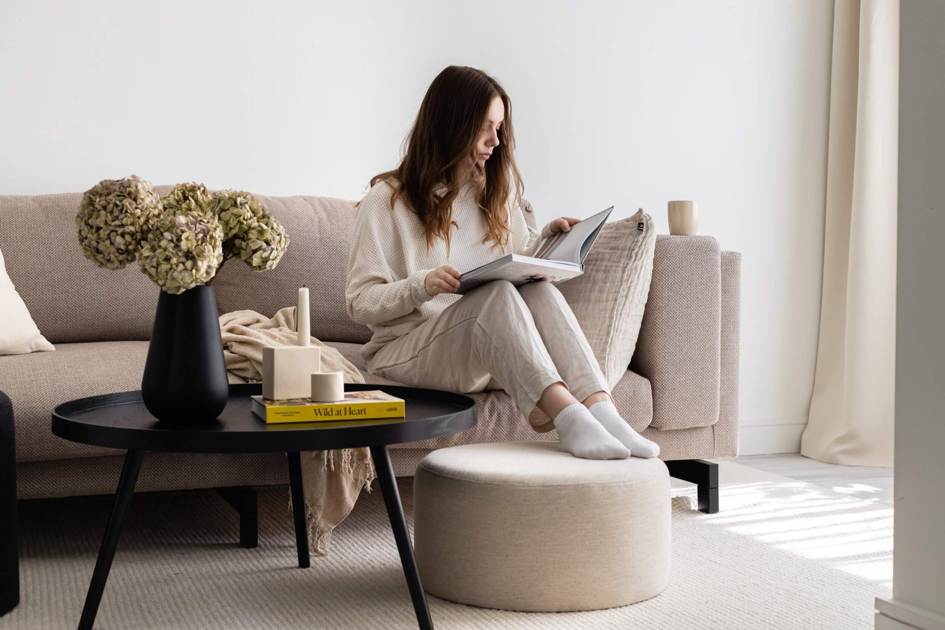 Don’t be afraid to mix things up - I like to keep a simple base with the soft white and beige decor, and then place a few darker pieces to add some contrast. The dark grey wool has a beautiful texture that makes it a great addition to the white and beige. By adding different textures you’re giving the minimalistic space some warmth and coziness while still keeping it to a minimum.